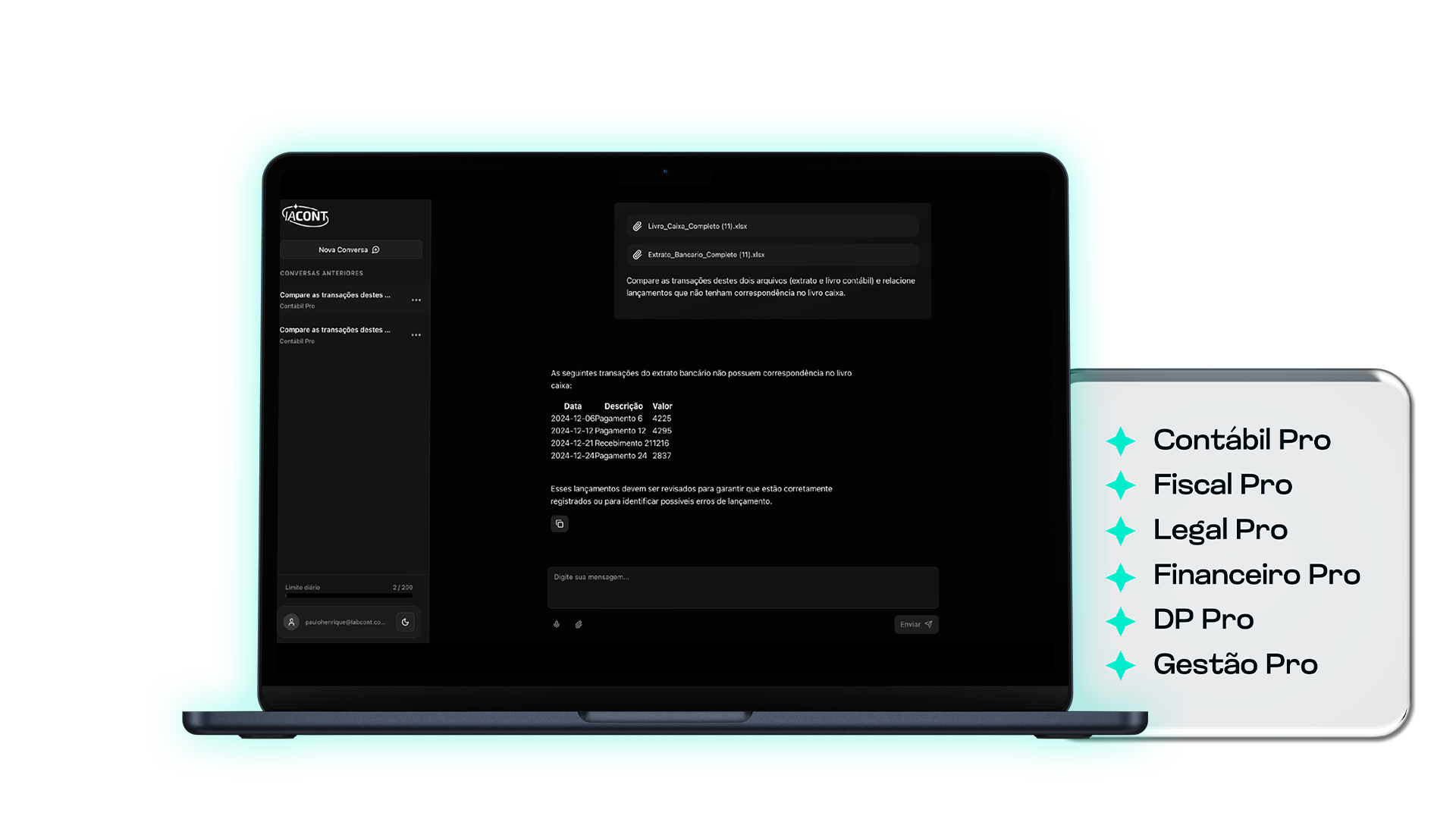 Envie contratos, balancetes, guias ou demonstrativos e receba análises automáticas, comentários técnicos e alertas de inconsistência. Com a IA Cont, a leitura e interpretação de documentos contábeis, fiscais, trabalhistas e financeiros fica mais rápida, precisa e segura.
